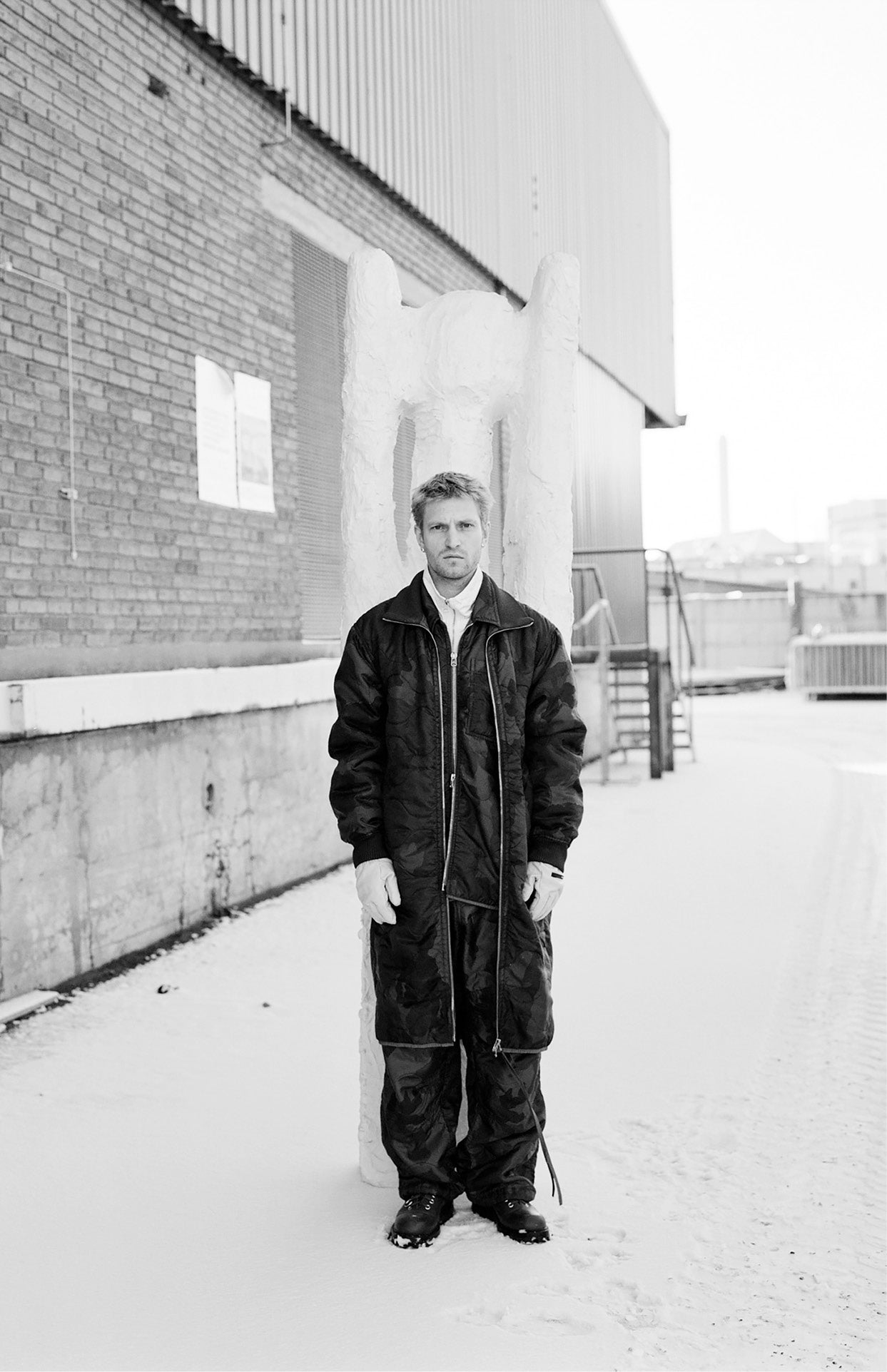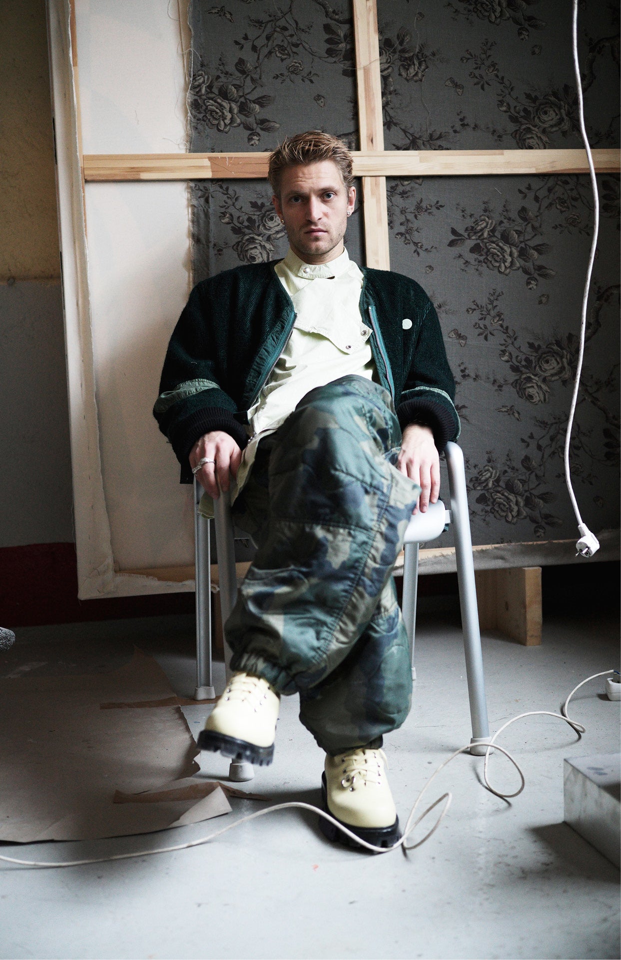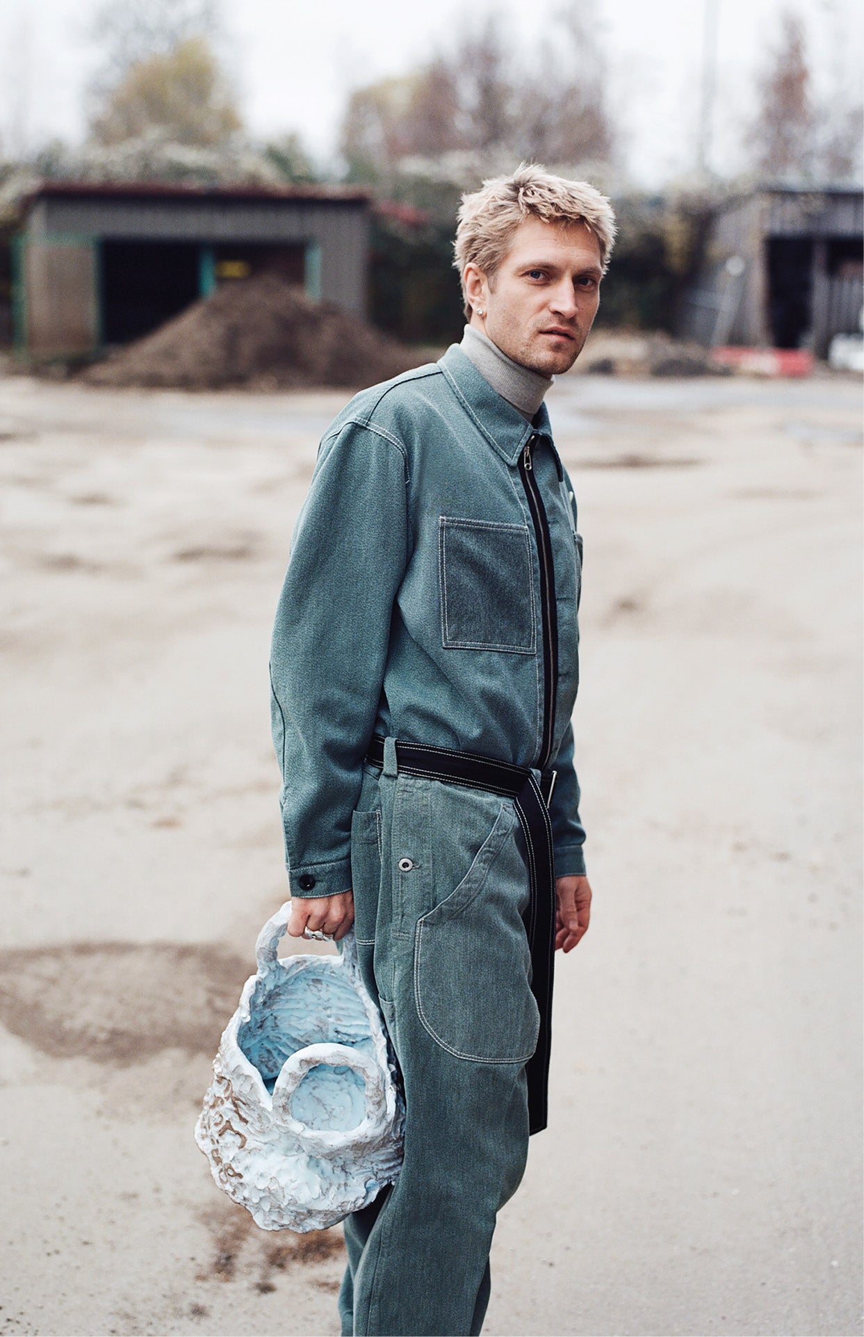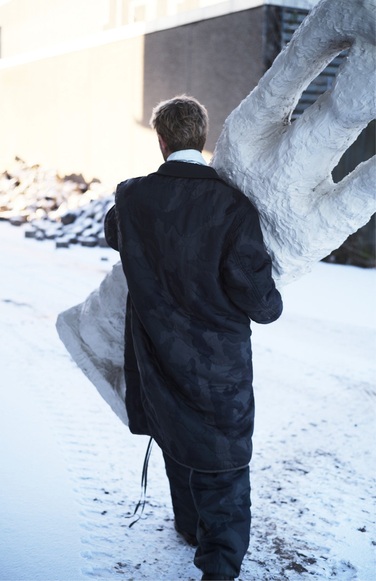 Photographed by Chris Lensz for OAMC, Nystrup-Larsen wears the OAMC Re:Work Fall/ Winter 2022 collection in and around his Copenhagen studio, revealing a cacophony of forms from his working archive. Amongst them, strange lamps formed in metal and jersey knit are informed by his layered impressions of Tai Chi poses, and hybrid readymades poke fun at sports and industry. Propped up in the snow under the wintersun, papier maché structures are remnants of a commentary on the aesthetics of early video game culture – warped sentinels that hint at both abstract and figurative forms in Nystrup-Larsen’s dynamic opus. Though seemingly disparate, these objects are but a glimpse into the Royal College of Art graduate’s thought and work process, one that constantly questions the world around him, toying with the absurdity of consumer culture, technology, the legacy of art history, and even the permanence of art itself. Case in point: a 2019 project titled OFF LICENSE CASH ONLY, where Nystrup-Larsen (together with Oliver Sundqvist) fabricated a pop-up store of brightly-painted papier maché trash and sold over 100 pieces at the market value of their imaginary contents.