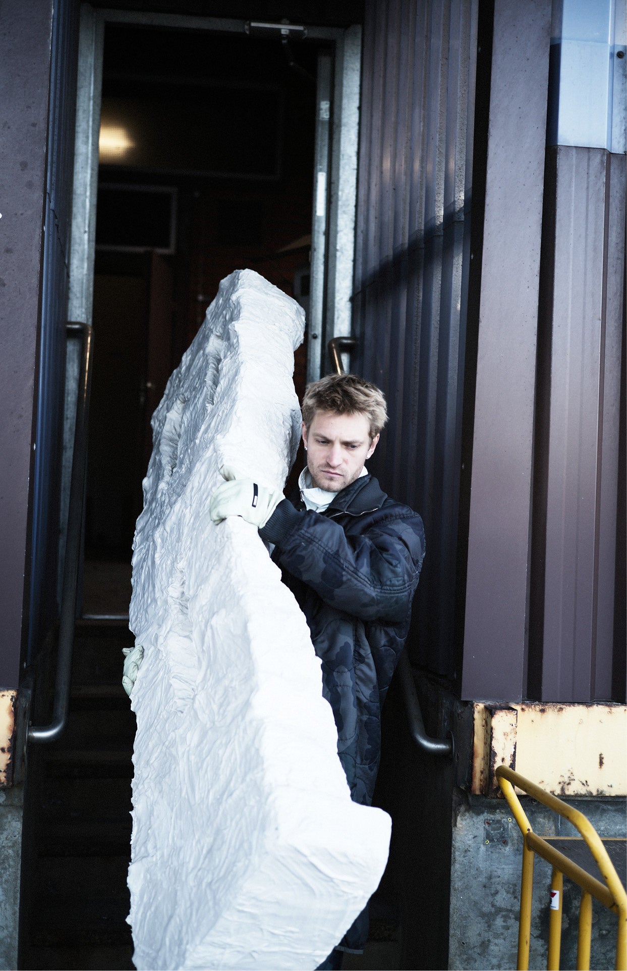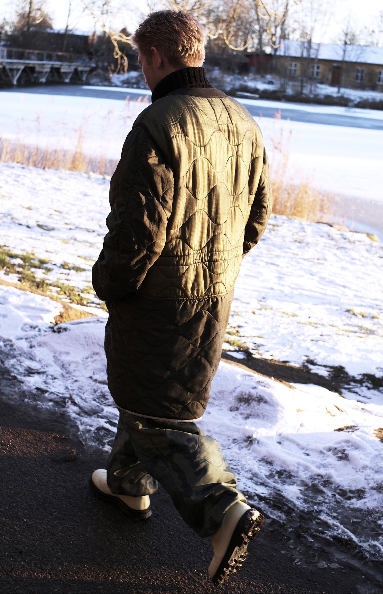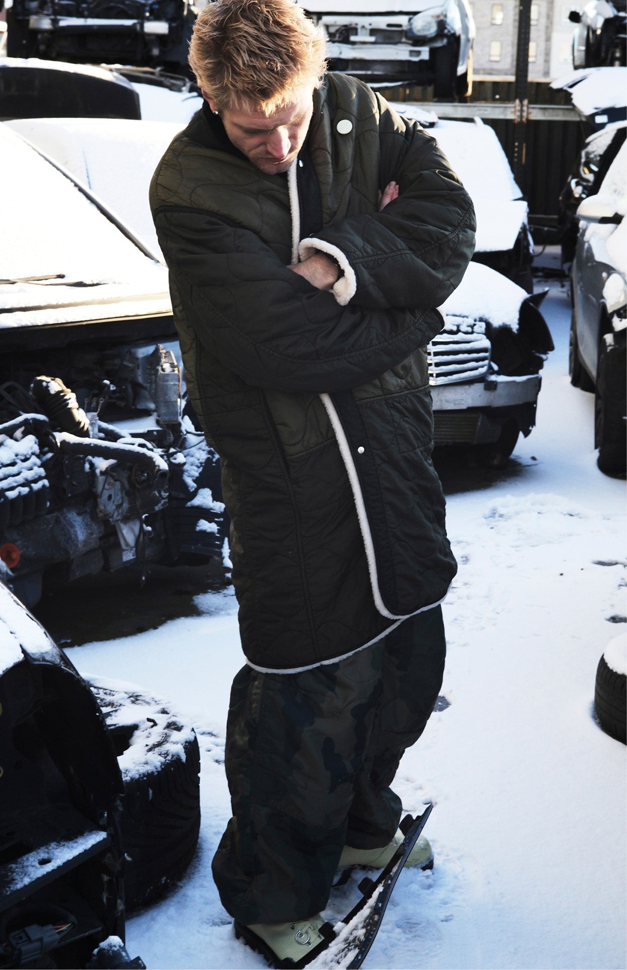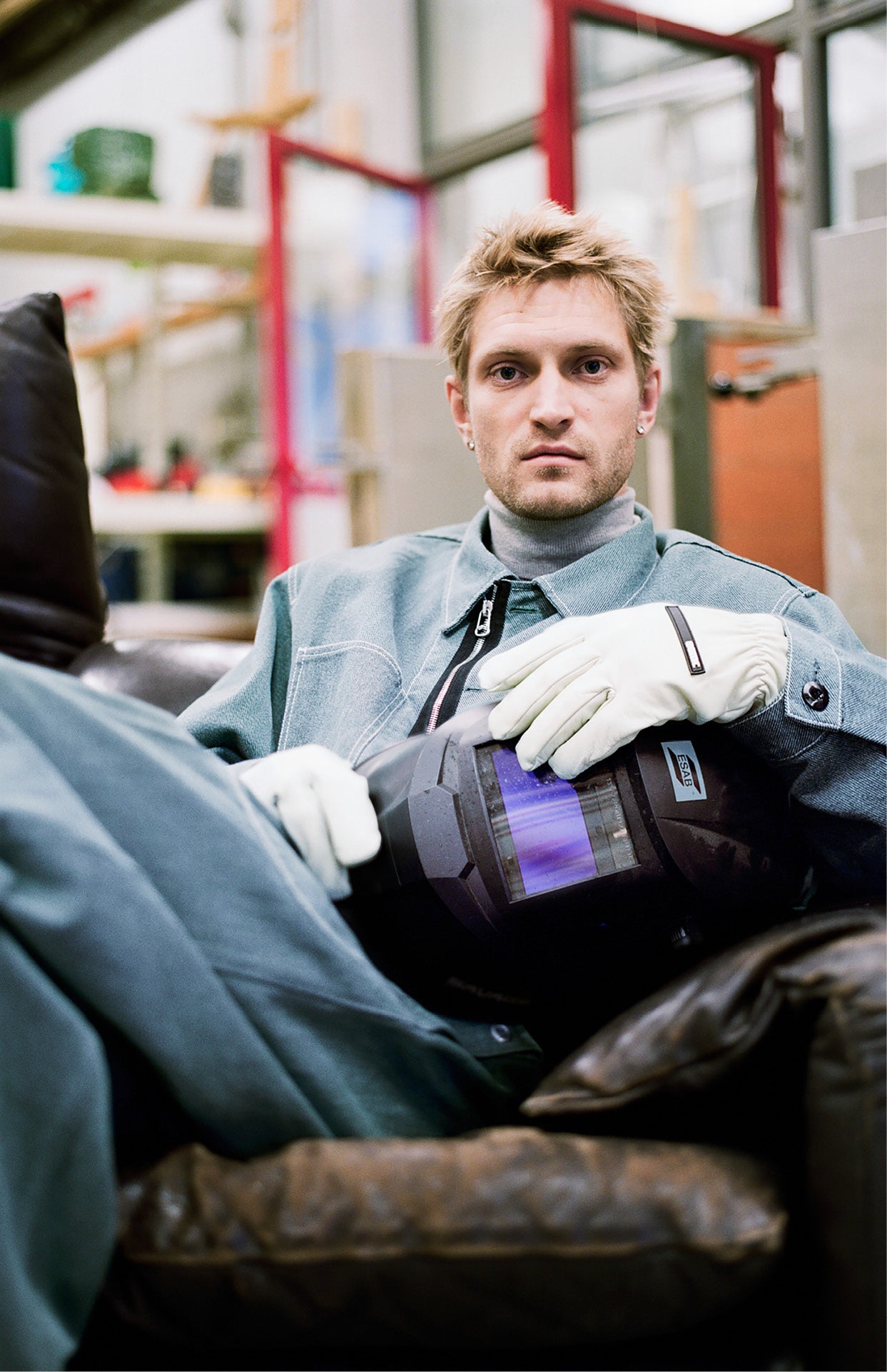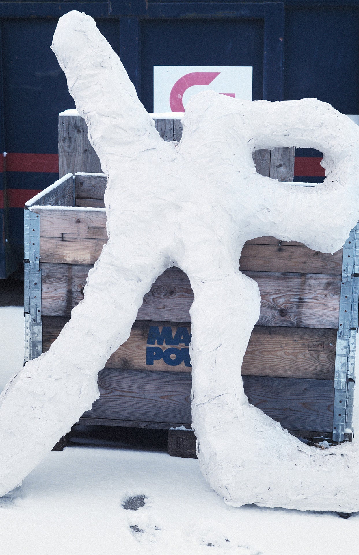 Photographed by Chris Lensz for OAMC, Nystrup-Larsen wears the OAMC Re:Work Fall/ Winter 2022 collection in and around his Copenhagen studio, revealing a cacophony of forms from his working archive. Amongst them, strange lamps formed in metal and jersey knit are informed by his layered impressions of Tai Chi poses, and hybrid readymades poke fun at sports and industry. Propped up in the snow under the wintersun, papier maché structures are remnants of a commentary on the aesthetics of early video game culture – warped sentinels that hint at both abstract and figurative forms in Nystrup-Larsen’s dynamic opus. Though seemingly disparate, these objects are but a glimpse into the Royal College of Art graduate’s thought and work process, one that constantly questions the world around him, toying with the absurdity of consumer culture, technology, the legacy of art history, and even the permanence of art itself. Case in point: a 2019 project titled OFF LICENSE CASH ONLY, where Nystrup-Larsen (together with Oliver Sundqvist) fabricated a pop-up store of brightly-painted papier maché trash and sold over 100 pieces at the market value of their imaginary contents.