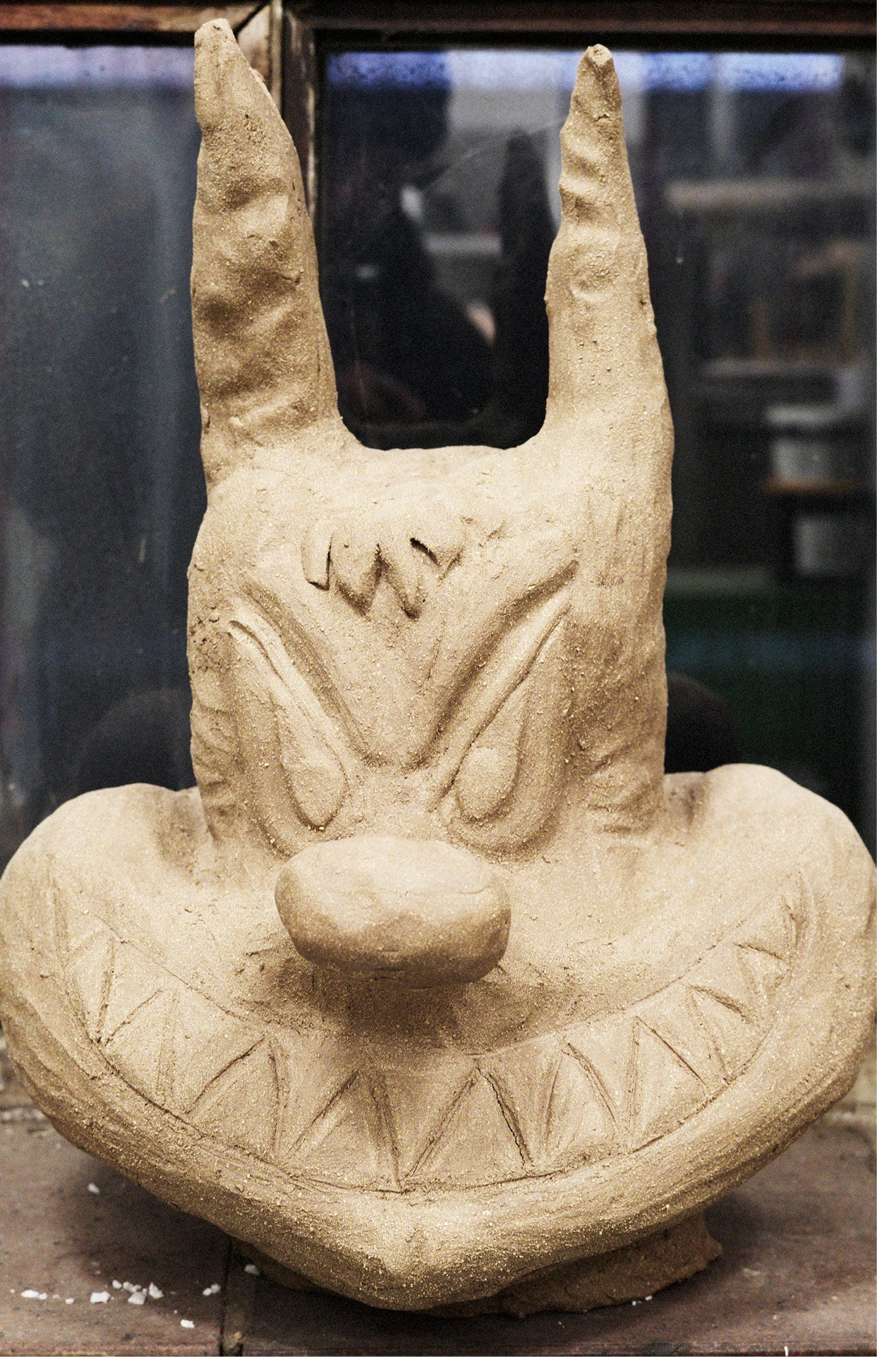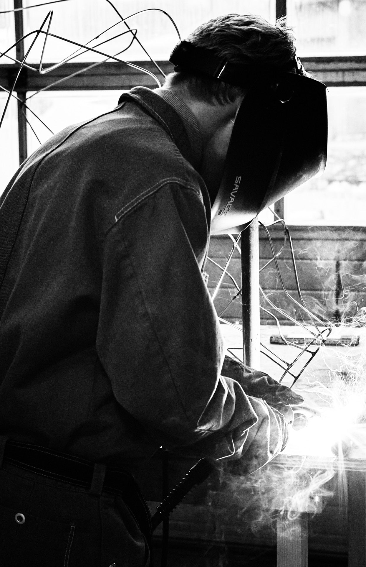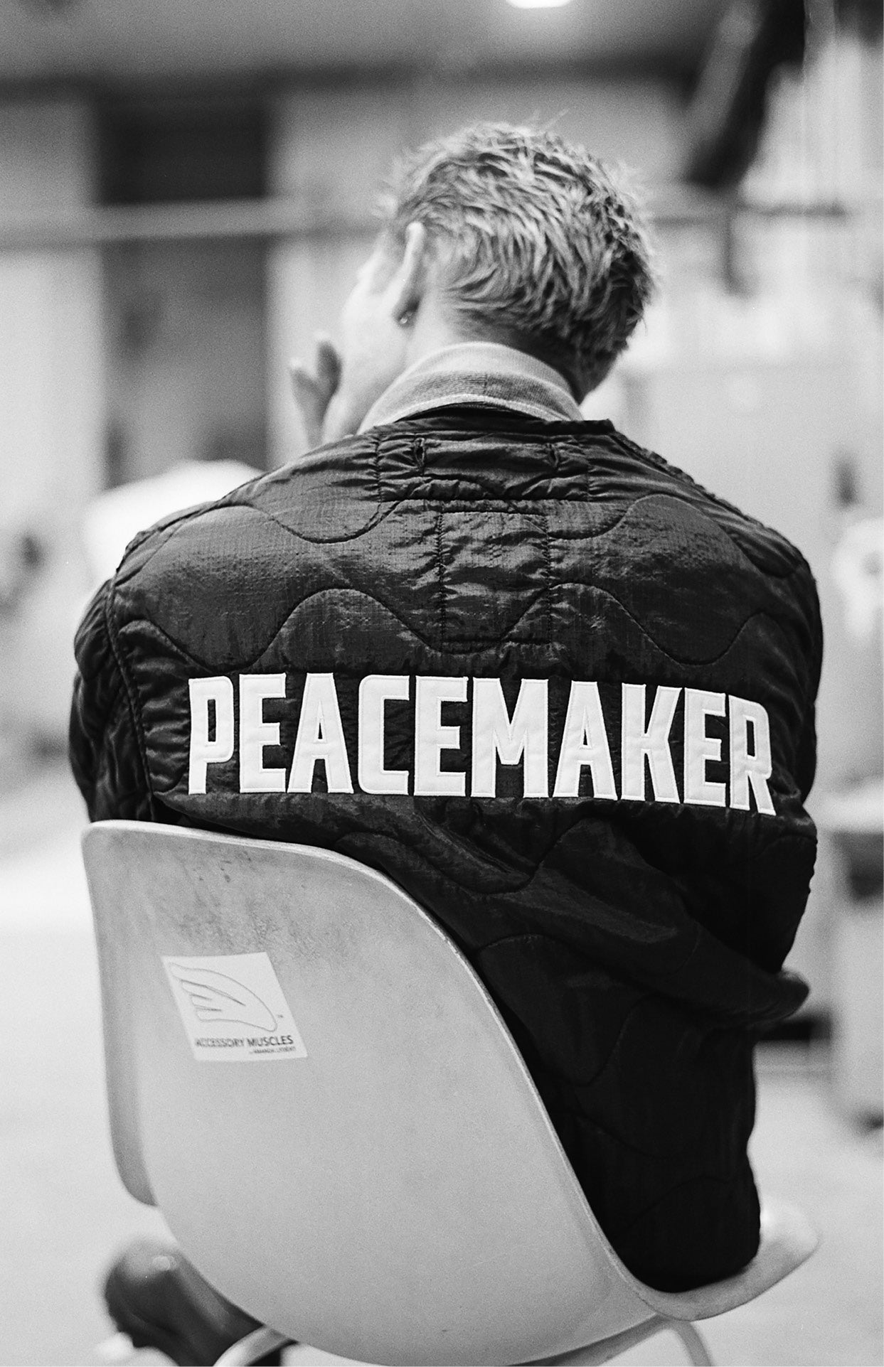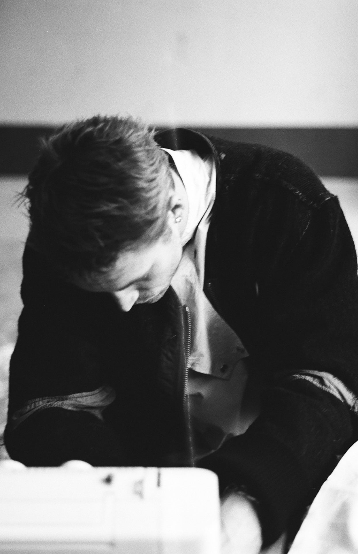Photographed by Chris Lensz for OAMC, Nystrup-Larsen wears the OAMC Re:Work Fall/ Winter 2022 collection in and around his Copenhagen studio, revealing a cacophony of forms from his working archive. Amongst them, strange lamps formed in metal and jersey knit are informed by his layered impressions of Tai Chi poses, and hybrid readymades poke fun at sports and industry. Propped up in the snow under the wintersun, papier maché structures are remnants of a commentary on the aesthetics of early video game culture – warped sentinels that hint at both abstract and figurative forms in Nystrup-Larsen’s dynamic opus. Though seemingly disparate, these objects are but a glimpse into the Royal College of Art graduate’s thought and work process, one that constantly questions the world around him, toying with the absurdity of consumer culture, technology, the legacy of art history, and even the permanence of art itself. Case in point: a 2019 project titled OFF LICENSE CASH ONLY, where Nystrup-Larsen (together with Oliver Sundqvist) fabricated a pop-up store of brightly-painted papier maché trash and sold over 100 pieces at the market value of their imaginary contents.
