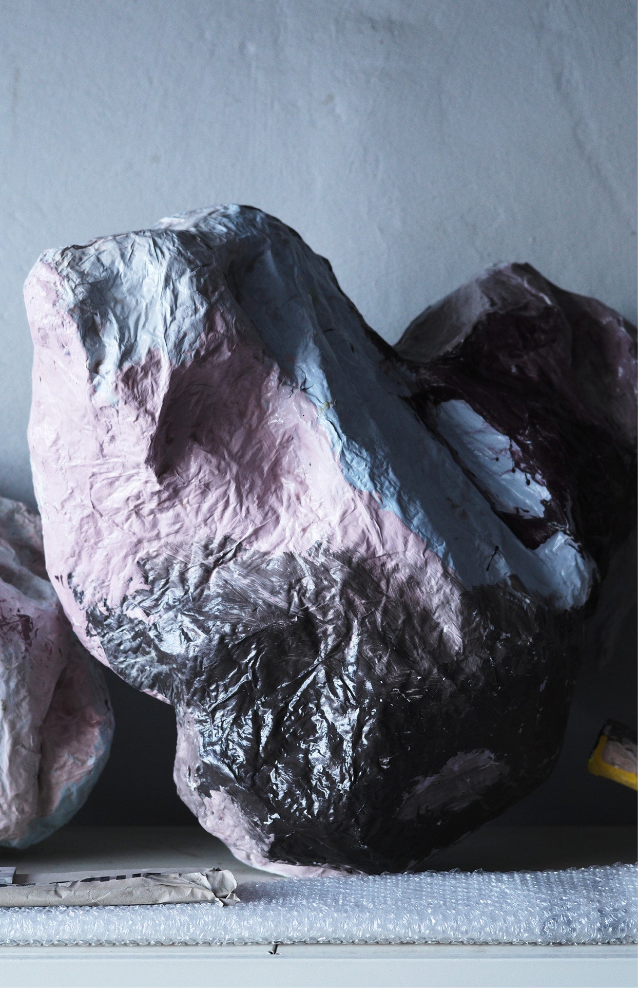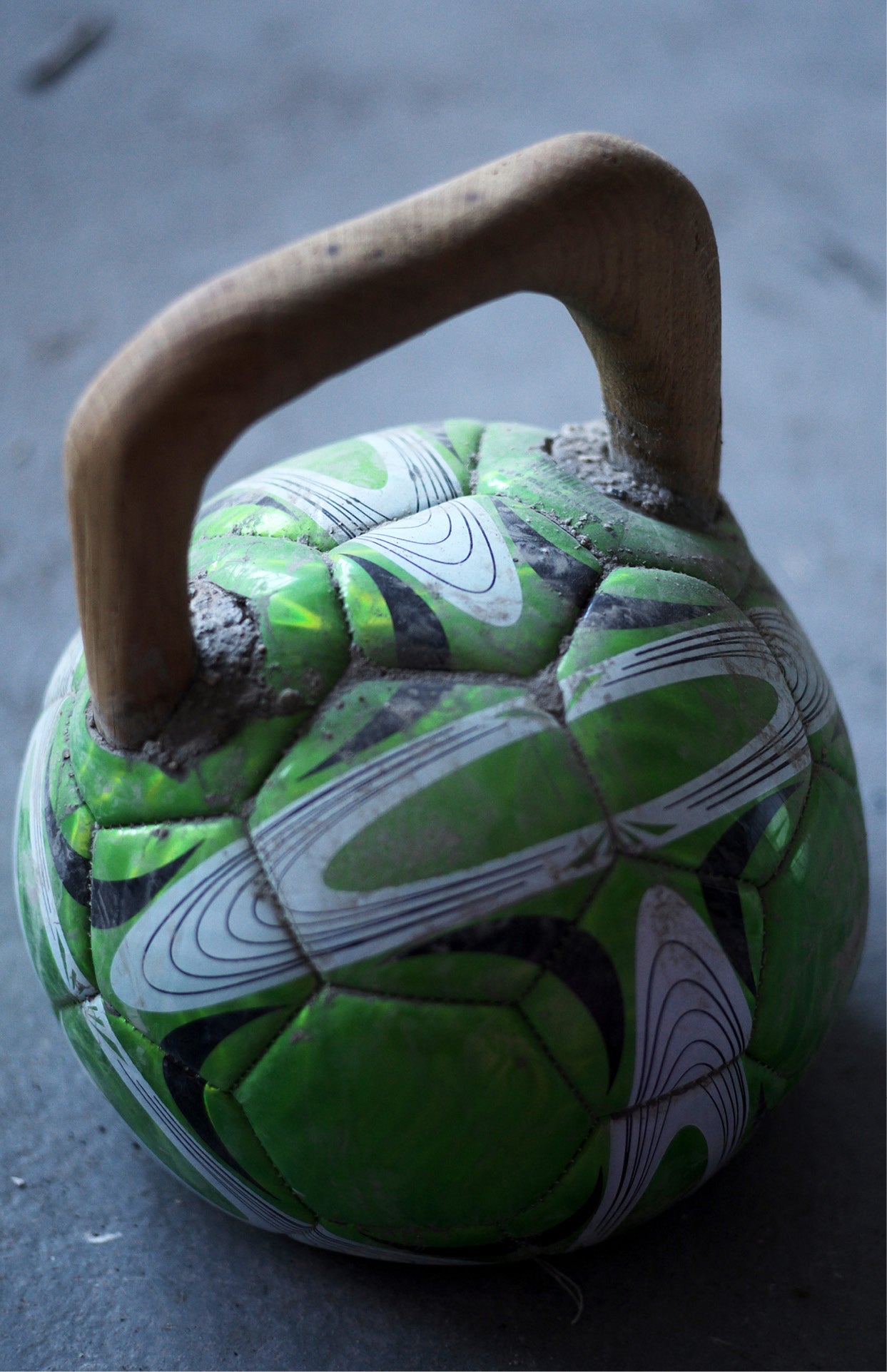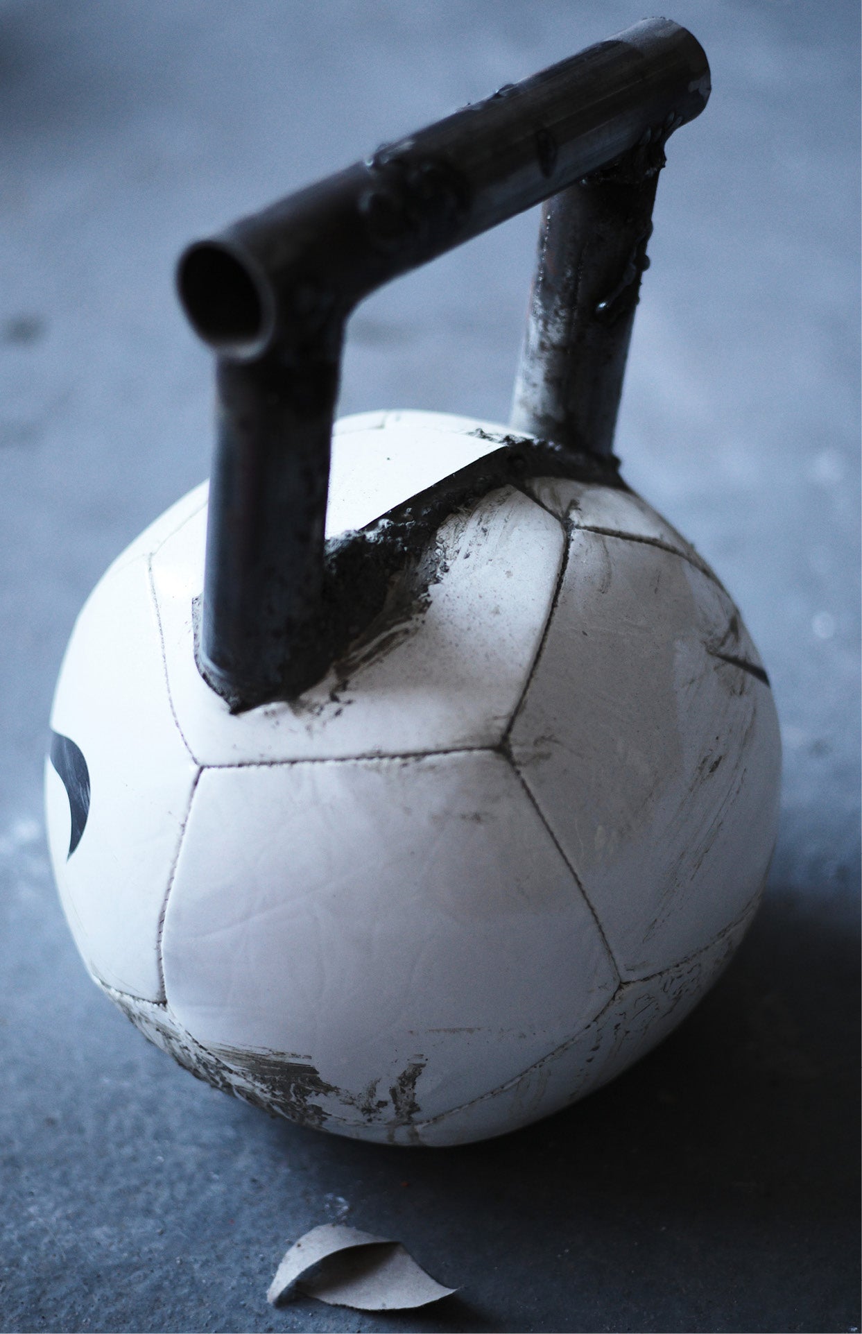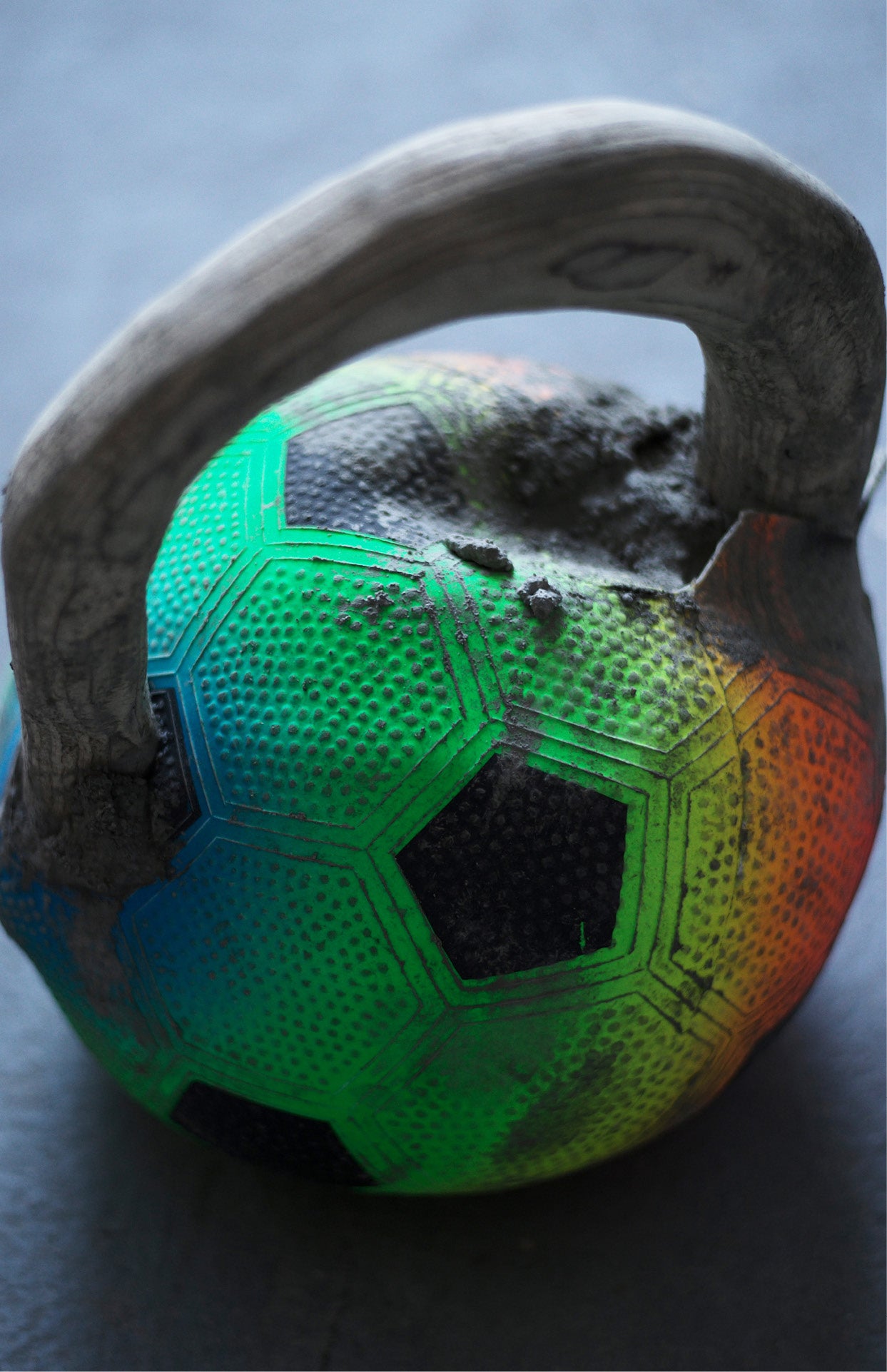 Here in the studio at the moment, some of my newest works like the soccer ball pieces and tire weights are more like self-entertainment. Of course, everything I make comes from where I am in the world and in a way how I am in myself. The last couple of years have been so strange. I guess you start to think about your own health and getting older, and how these years just went by and stuff like that. And I just became interested in the concept of fitness, but also all the layers there are in keeping yourself in shape, and shaping yourself in terms of sculpture. These are experiments relating to how I want to approach fitness and there are so many elements I’m thinking about – it could be narcissism, it could be the protests when people weren’t allowed to use gyms during COVID. At first, I thought about placing them somewhere in public for anyone to use. Then I thought about casting them all perfectly. Then, it became more about the idea of using existing elements I have around me and putting them together, and thinking as easily about an object as being functional purely because of its weight. So at the moment, I’m just training with them in the studio!
