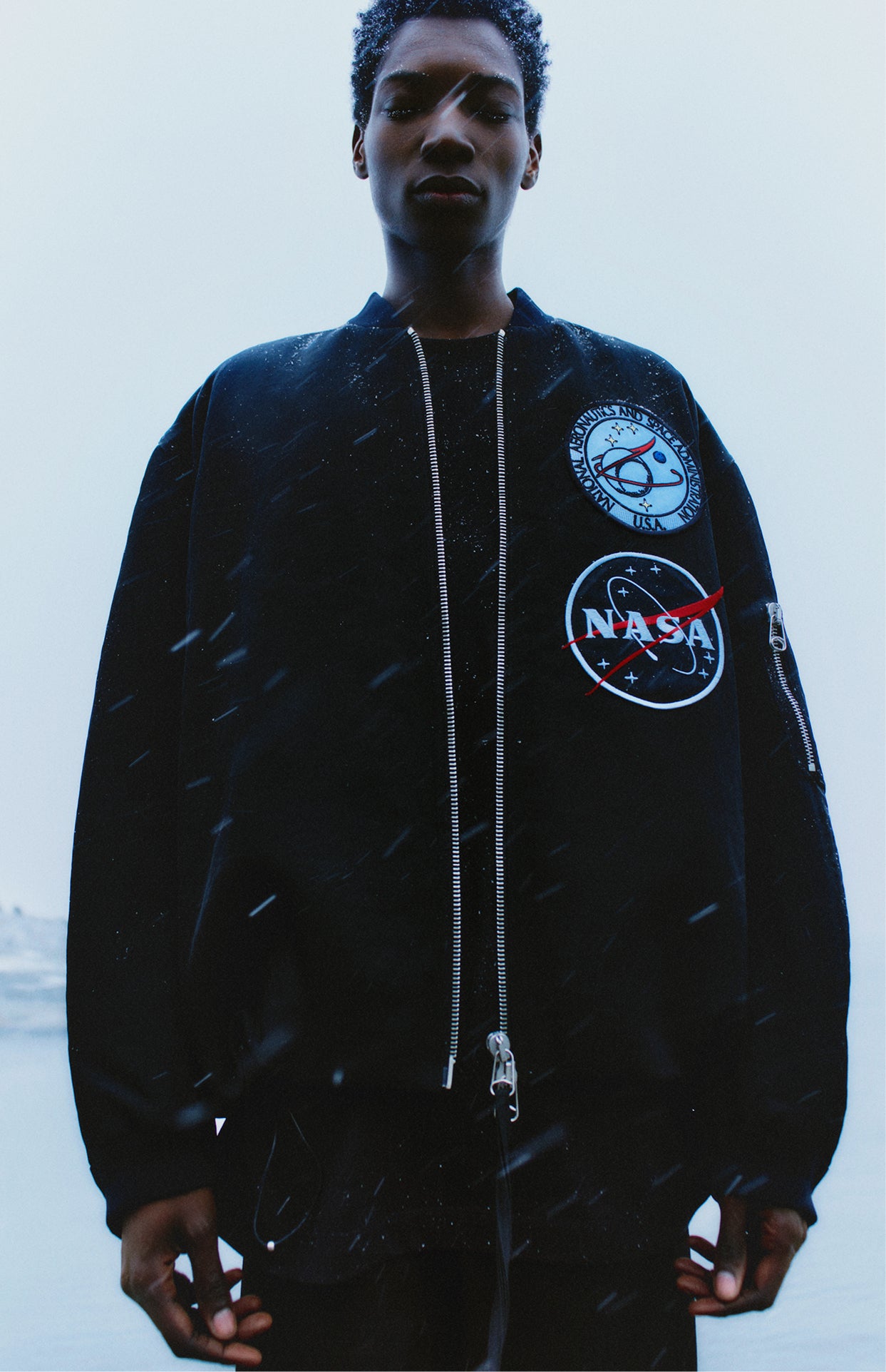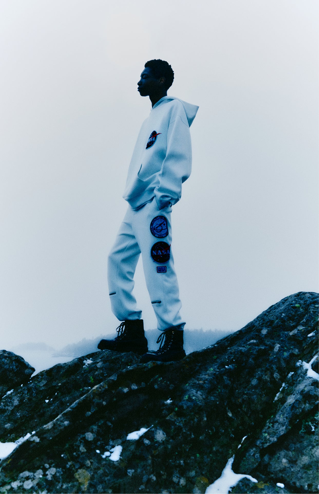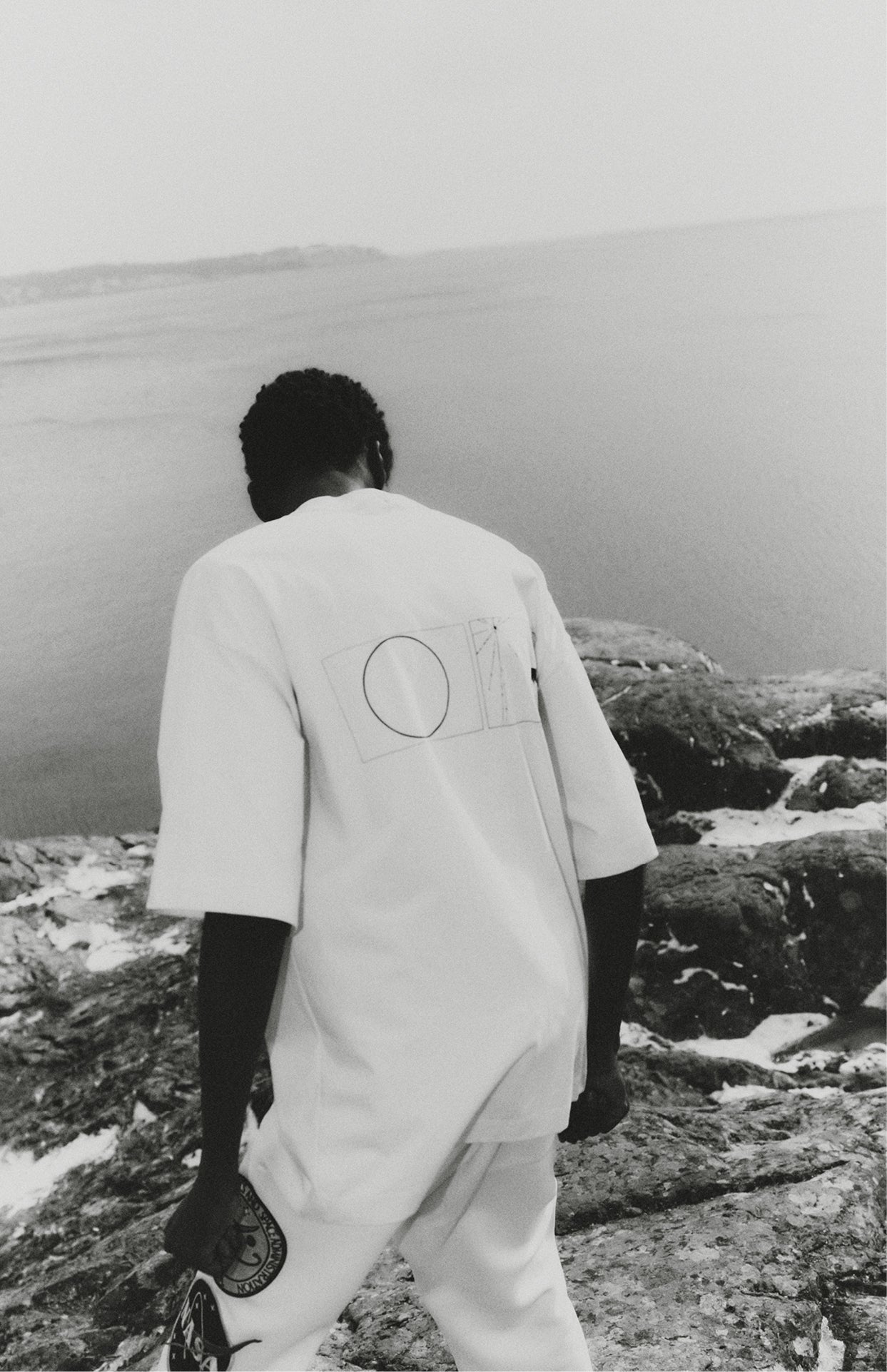 The collection consists of a loose-fit padded bomber jacket made from Japanese compact washed nylon gabardine, a padded and quilted liner in cotton poplin, hooded sweatshirts and sweatpants in Italian matt interlock nylon, oversized short-sleeved T-shirts in organic cotton, and a baseball cap realized in English Panama polyester.