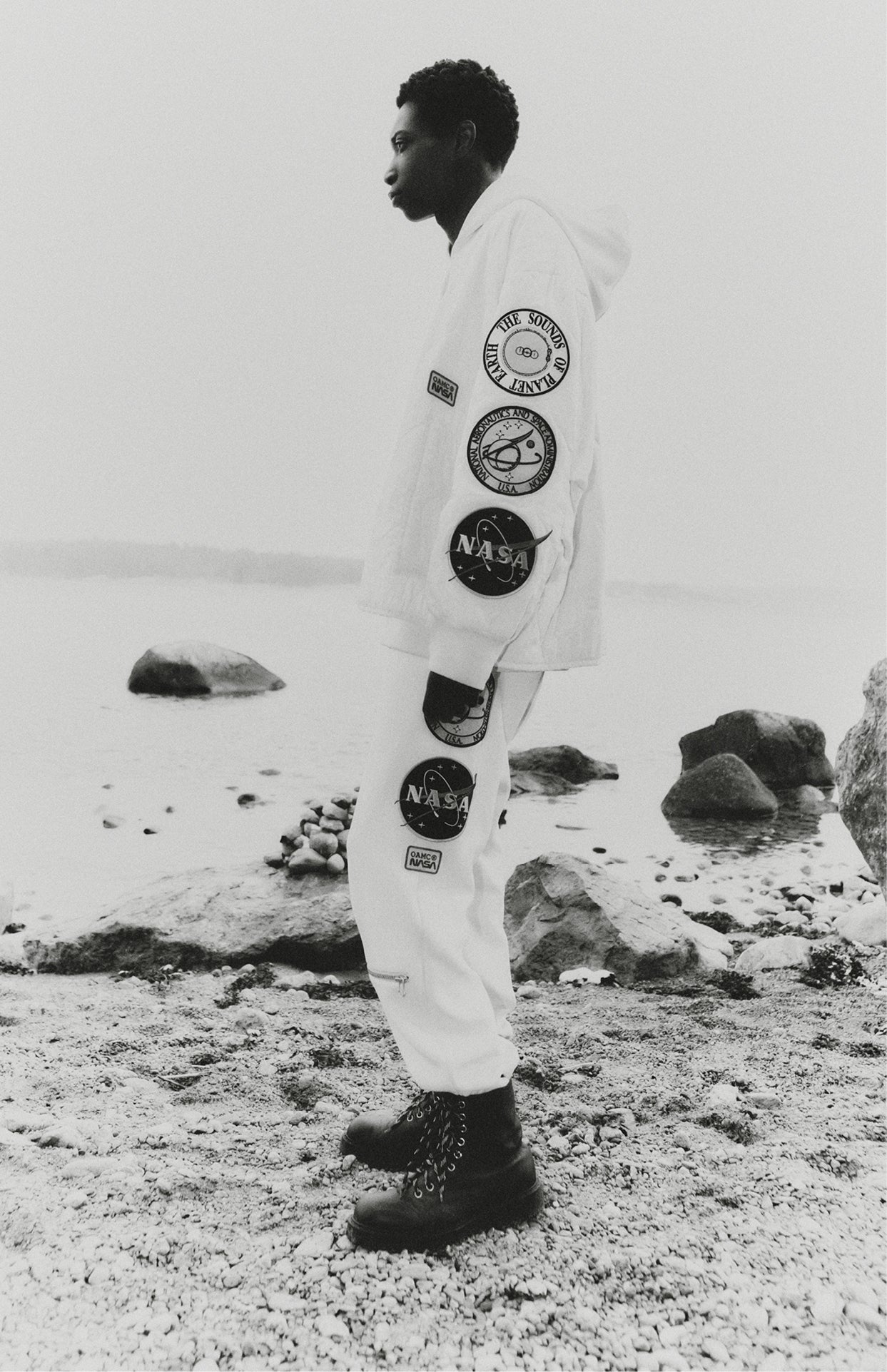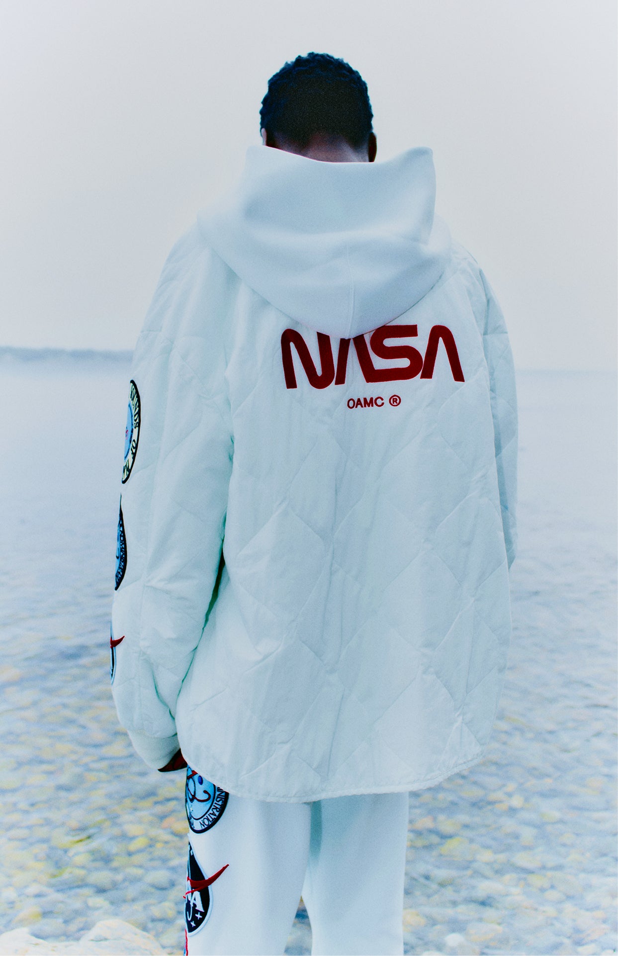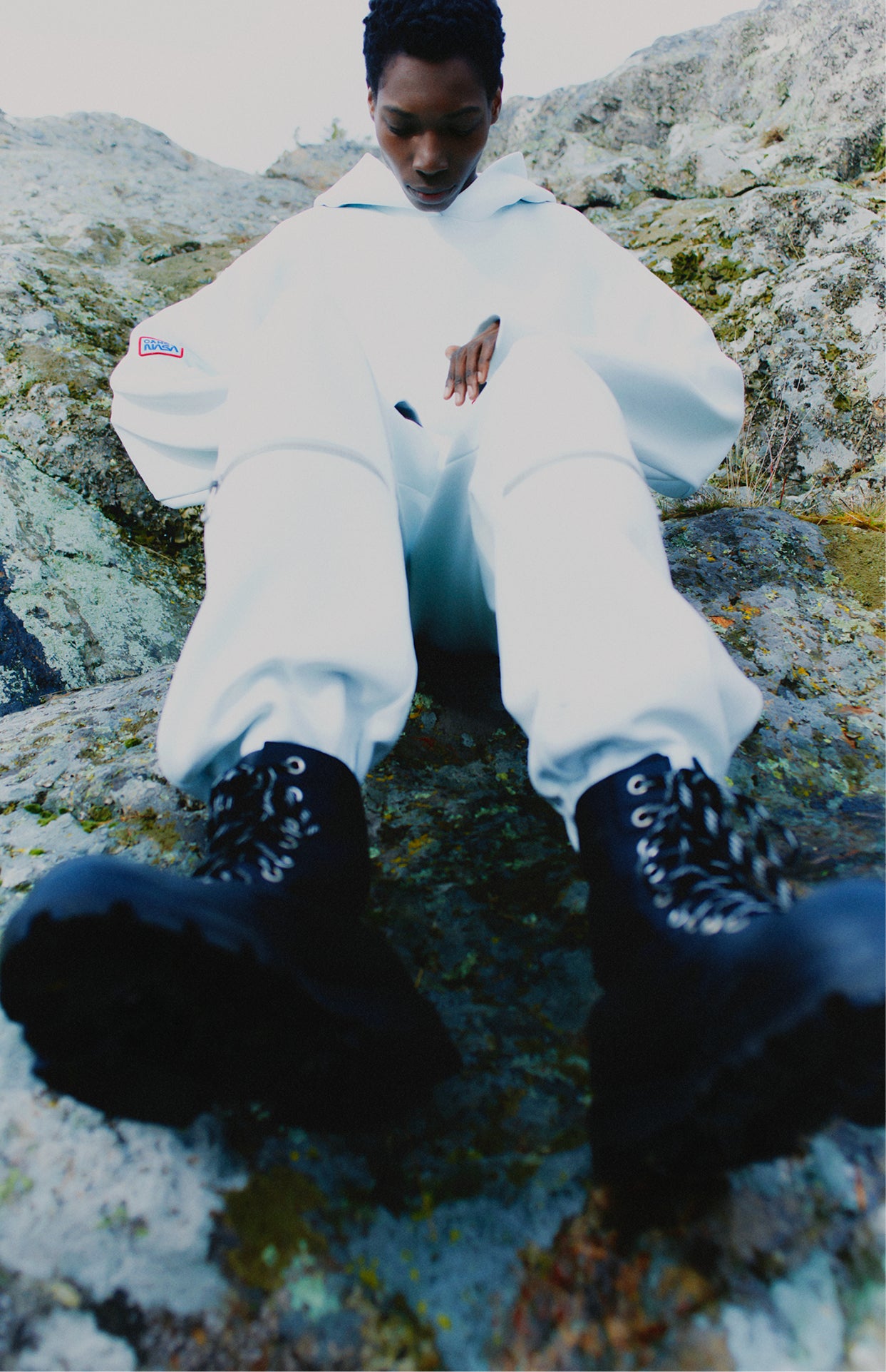 The collection consists of a loose-fit padded bomber jacket made from Japanese compact washed nylon gabardine, a padded and quilted liner in cotton poplin, hooded sweatshirts and sweatpants in Italian matt interlock nylon, oversized short-sleeved T-shirts in organic cotton, and a baseball cap realized in English Panama polyester.