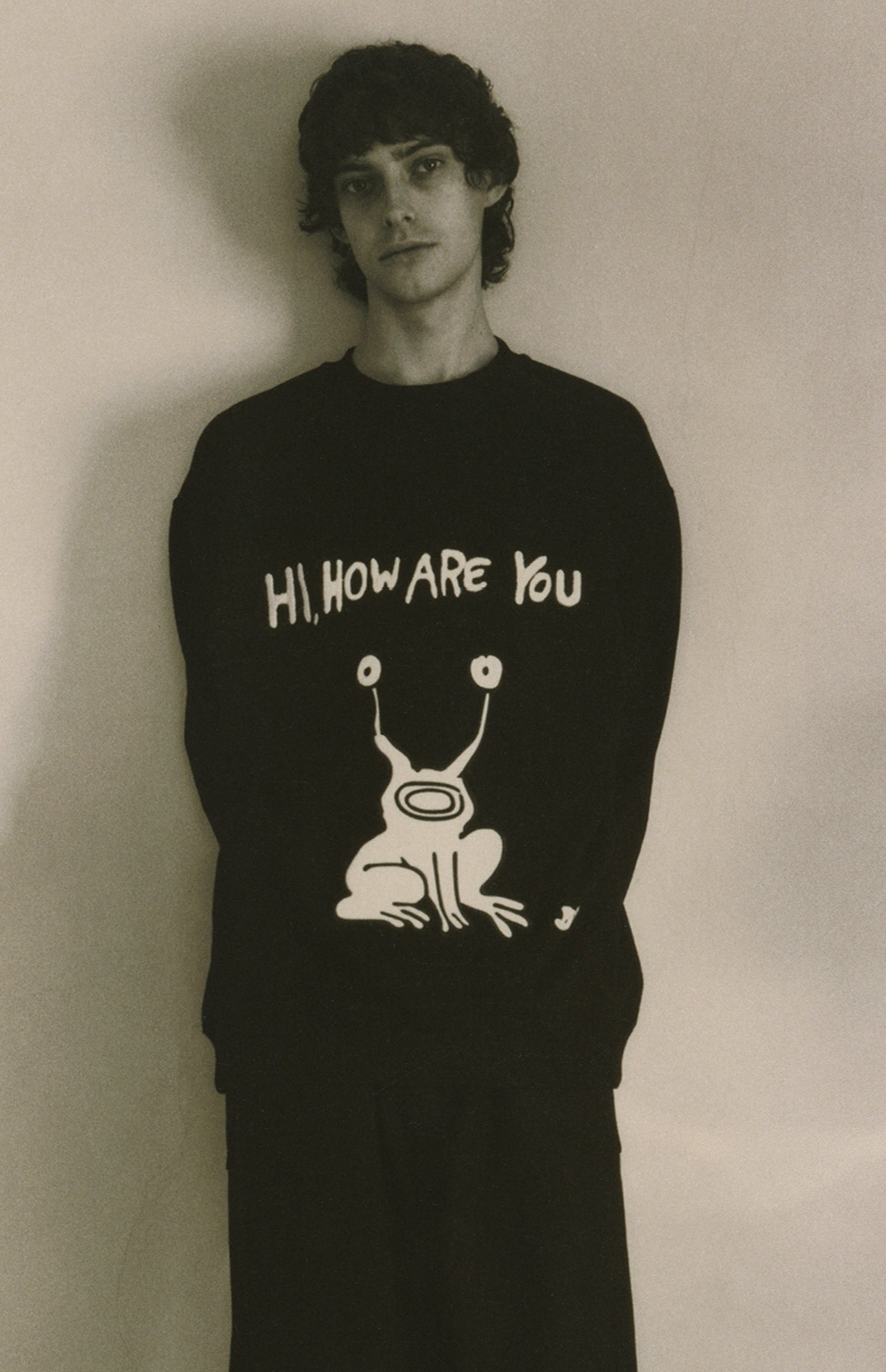 ダニエル・ジョンストンのエレミヤ・ザ・イノセントと「Hi, How Are You」のウール刺繍でライナー、クルーネックスウェットとフーディを飾り、ダニエル・ジョンストンのノートブックから採った他のアートワークを、特殊レジンでコーティングしたコットン製ワッペンや、ウェアに直接プリントしました。