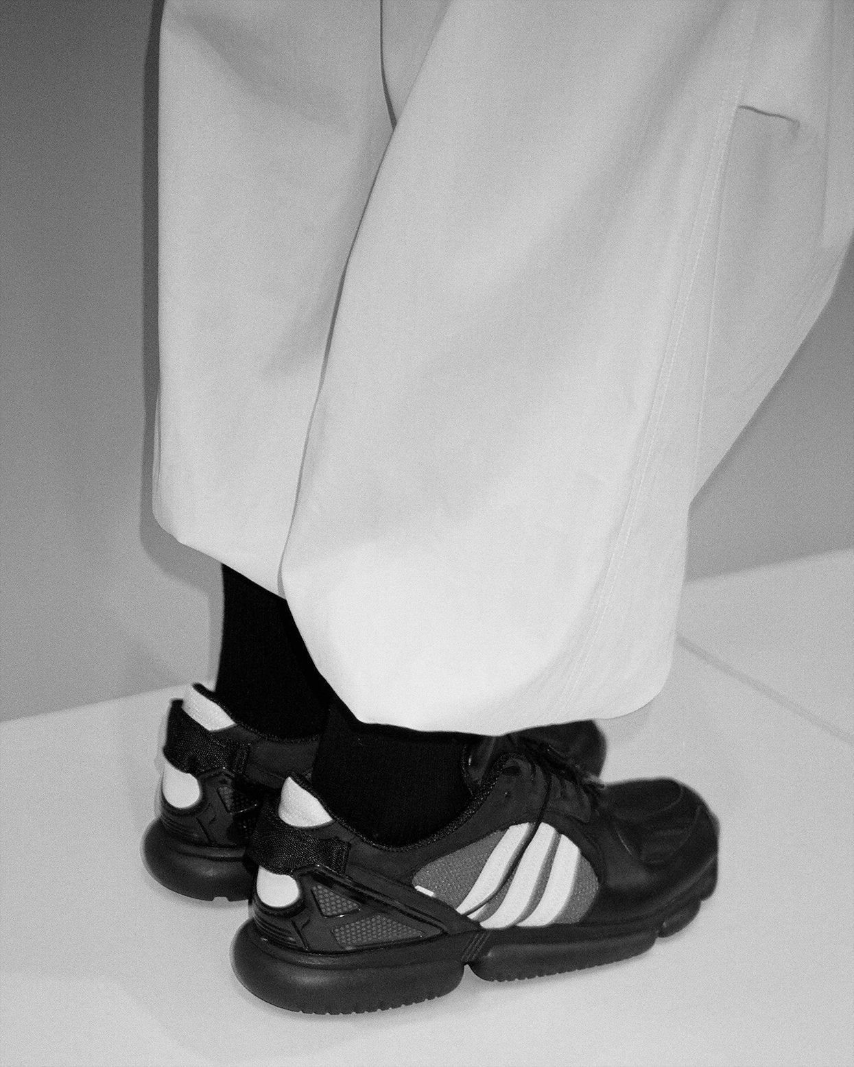 ソフトさの可能性を探り、コンパクトなコットンにあしらった縦向きのキルティングが長さを強調した優美なラインを描く一方、ミリタリー調を際立たせるガーメントダイナイロンのキルティングは、オーバーサイズの丸みのあるシルエットや、しまったシルエットのダーツ入りトラウザーズへとかたちを変えていきます。総バルカナイズド仕上げのハンマーヘッドトゥ付きブーツで、保護力を強調しました。高機能コーティング仕上げコットン製のふくらみを持たせたコート、フェルト化させたウールのトップコートには、日本から取り寄せた着物の帯を使用したベルトを付けています。森山大道氏による写真がコットンマトラッセや透かし編みニット地の上に重ねられ、コントラストが際立った現実と、柔らかく心地よい質感との対比を作り出しました。