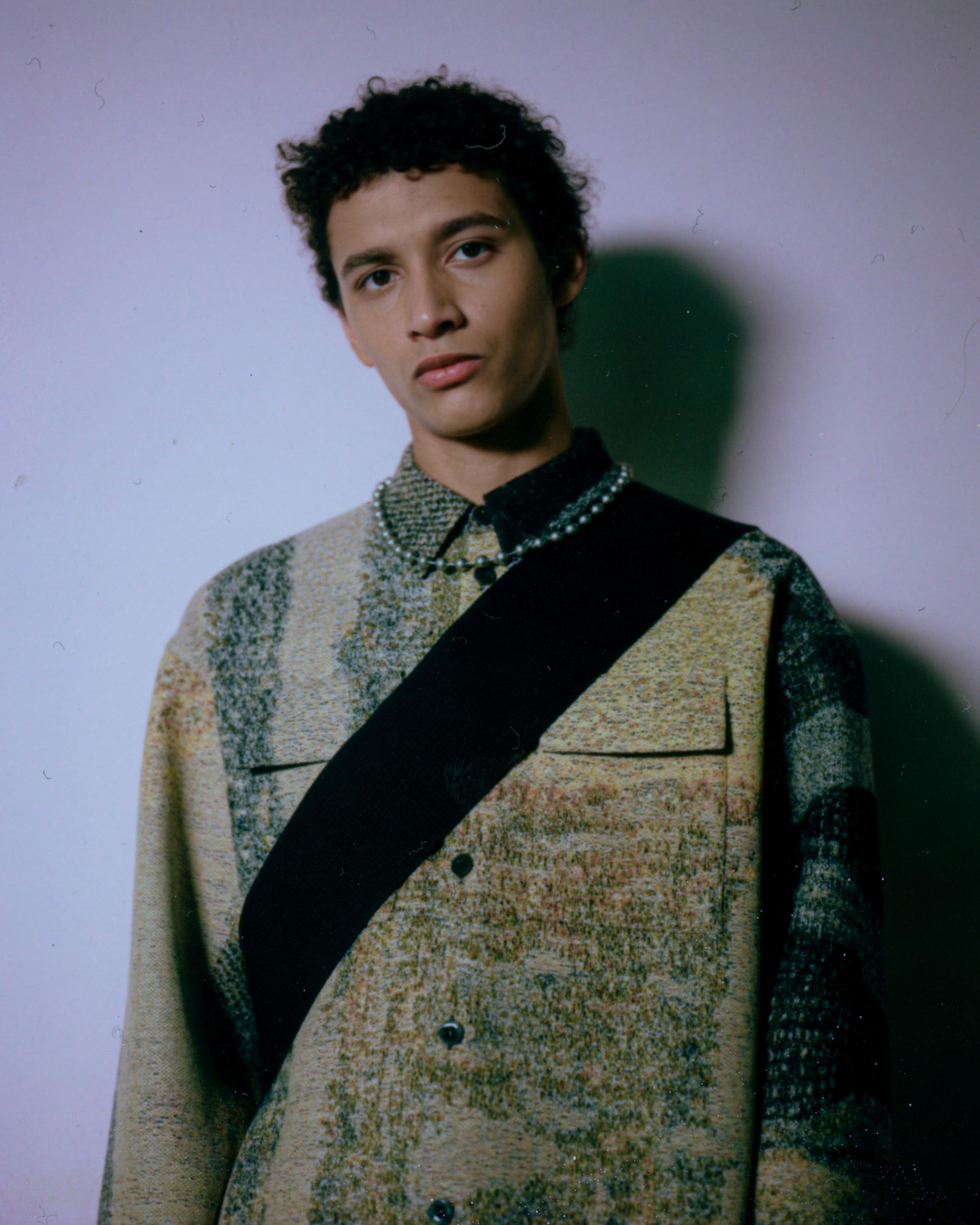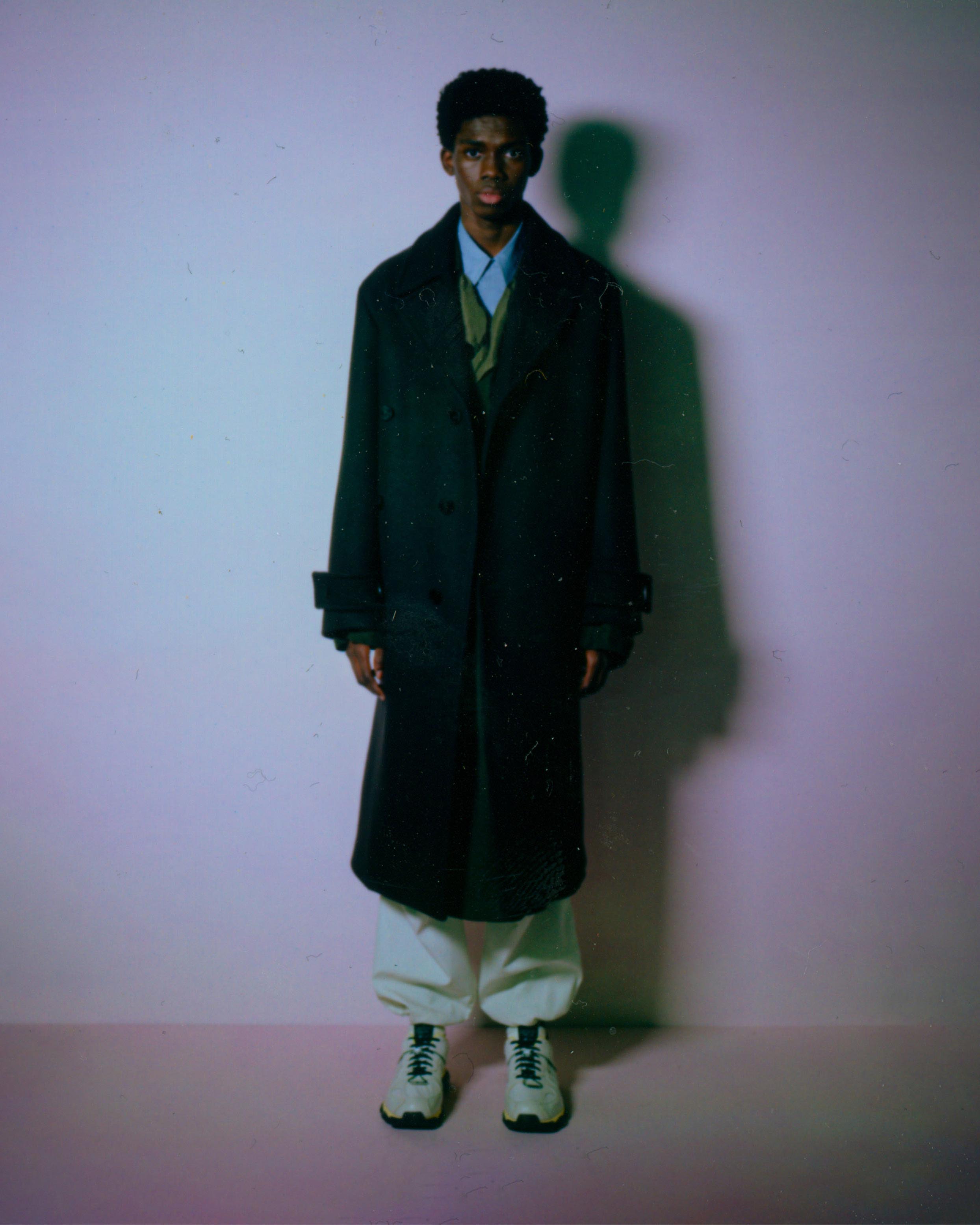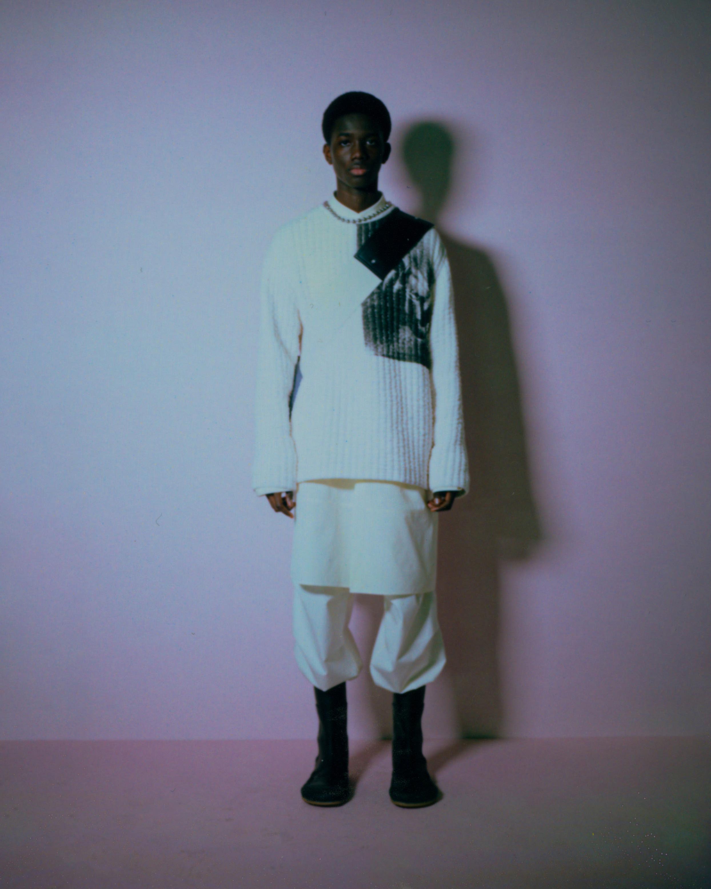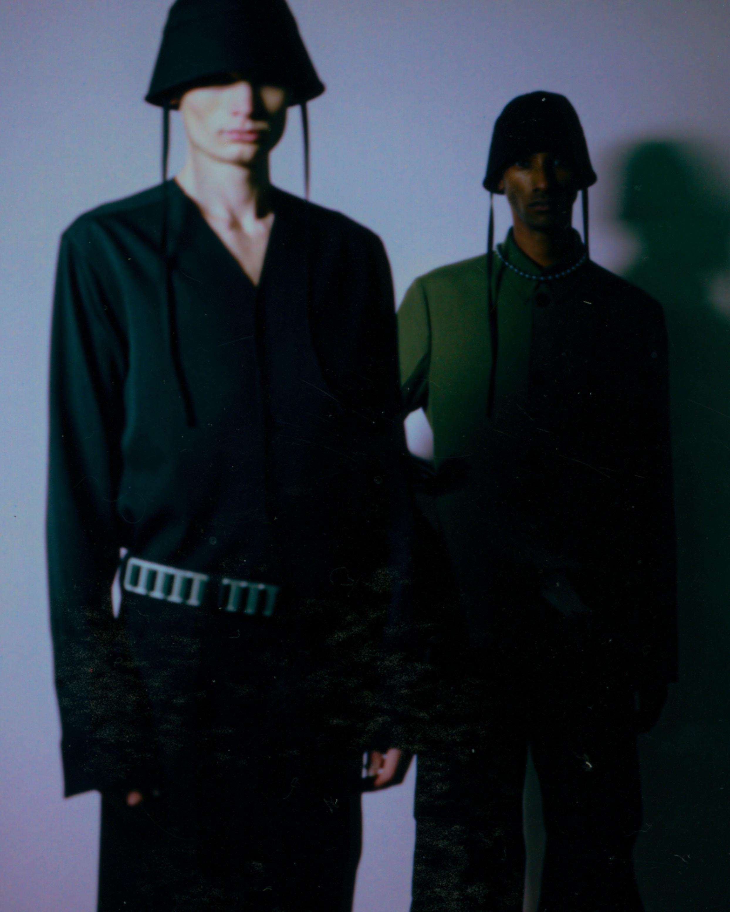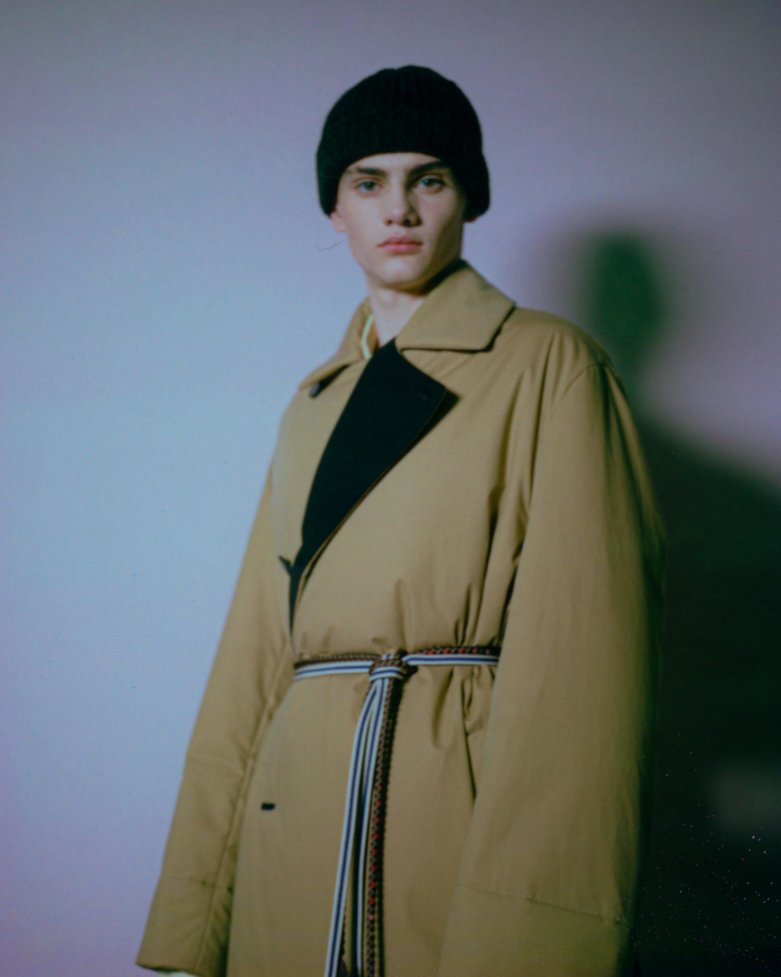 Explorations of softness are present. Vertical quilting on compact cotton is elongated and elegant, while more military-inspired garment-dyed nylon quilting becomes rounded with oversized, cinched and darted trousers. Fully vulcanized hammerhead-toed boots underline a protective feeling. Inflated coats in functional coated cottons, and felted wool topcoats are belted with traditional kimono cords from Japan. Photos by Daido Moriyama are found on cotton matelassé and open-stitch knit, a contrast between his high-contrast reality with soft, comforting textures.